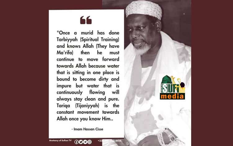 Once a murid has done Tarbiyyah (spiritual Trainging) and know Allah (They have Ma’rifa) then he must continue to move forward, towards Allah because water that is sitting in one place is bound to become dirty and impure but water that is continuously flowing will always stay clean and pure. Tariqa (Tijaniyyah) is the constant movement towards Allah once you know him.