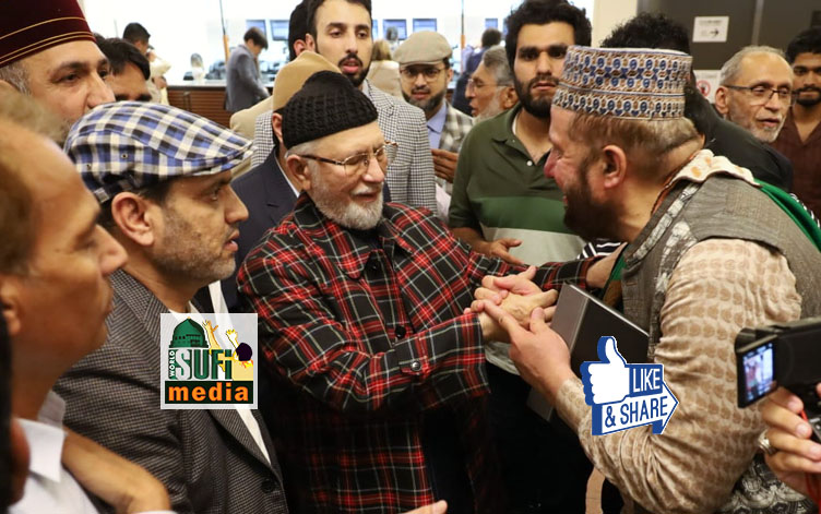 Shaykh-ul-Islam is joined by a distinguished group including Dr. Hassan Mohiuddin Qadri, Prof. Dr. Hussain Mohi-ud-Din Qadri, Dr. Ghazala Qadri, Shaykh Hammad Mustafa al-Madani al-Qadri, Mrs. Saffa Hammad Qadri, and Shaykh Ahmad Mustafa al-Arabi al-Qadri.